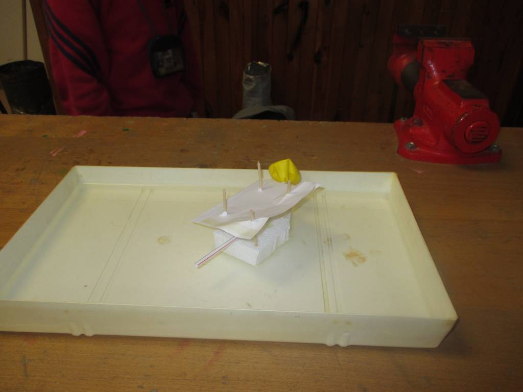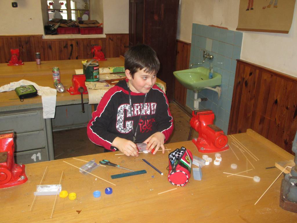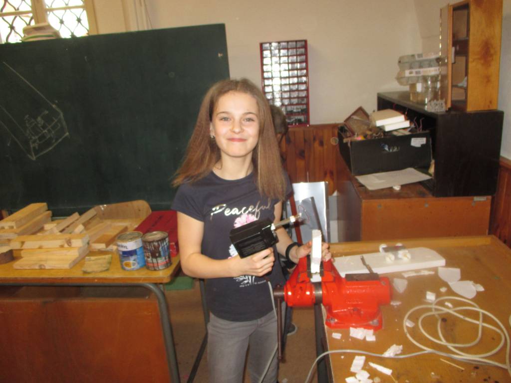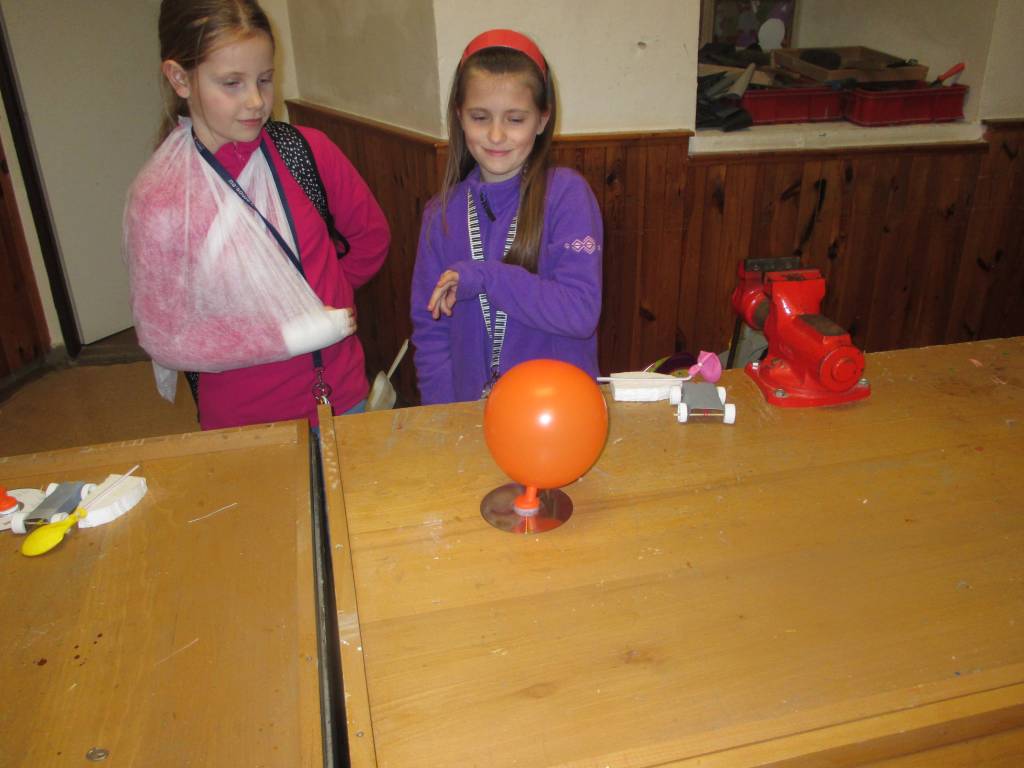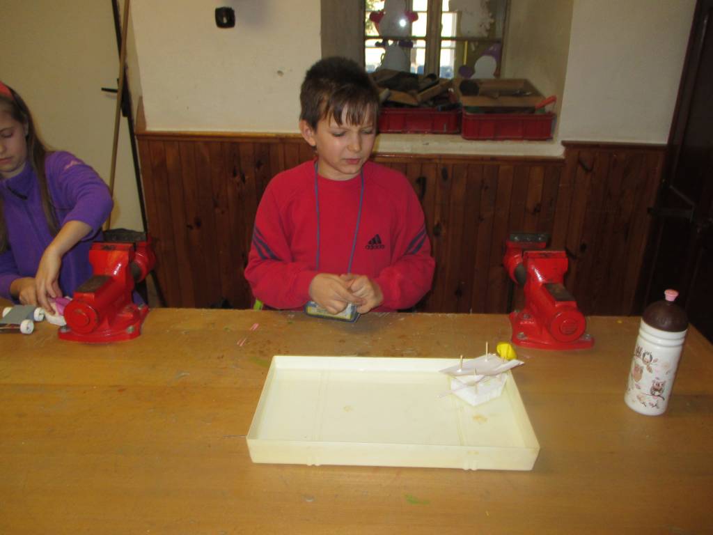 Mladí badatelé se vydali na další dvě lekce do školní dílny. Po nezbytném seznámení s vybavením se pustili do výroby pohyblivých modelů poháněných závažím, gumou nebo stlačeným vzduchem. Sestrojili tak vznášedlo, pohyblivou plechovku, model autíčka a lodě.