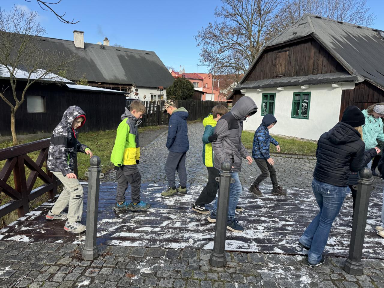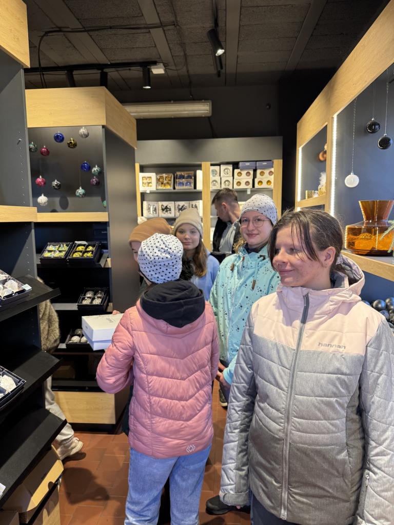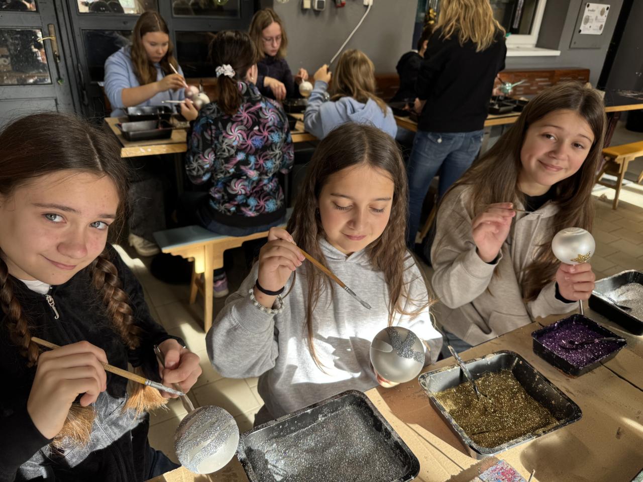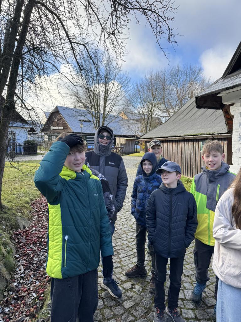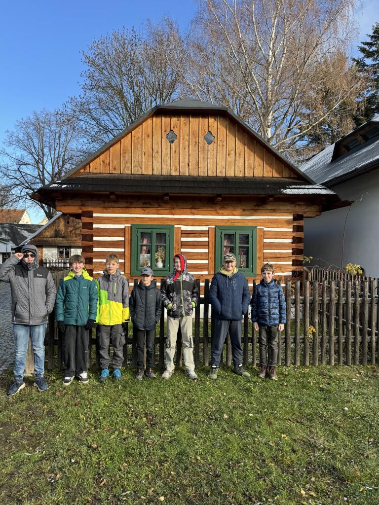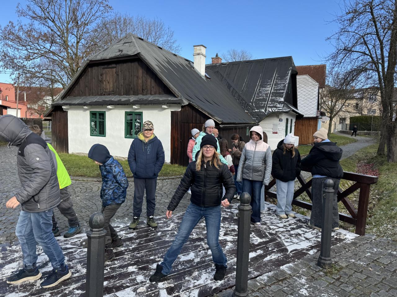 Roubenky v Hlinsku jsme si prohlédly sami, ale dostávali jsme záludné otázky v češtině i angličtině. Zjistili jsme jak bydlí ševc, pilníkář, hračkář atd. V jednom z domků je expozice masopustních masek z Hlinecka ( zapsáno v UNESCO ). Pak jsme se přesunuli do firmy Koulier v Oflendě. Prohlédli jsme si výstavu vánočních stromků, hledali jsme nejhezčí stromek nebo dvojice, které k sobě patří. Navštívili jsme místní obchůdek s ozdobami. Nakonec nás čekala prohlídka firmy od foukání skla až po zdobení a balení ozdob (nesmělo se tam fotit) .Pak jsme si sami vyzkoušeli zdobení ozdob ,zjistili jsme , že to není nic jednoduchého. Bylo to super.