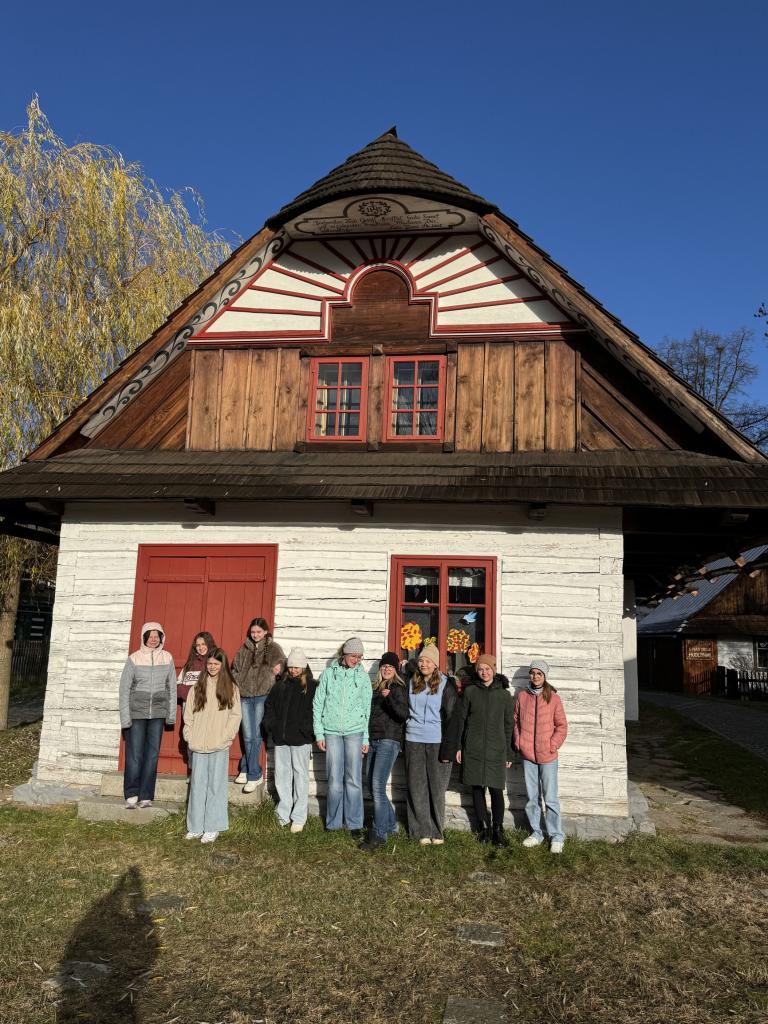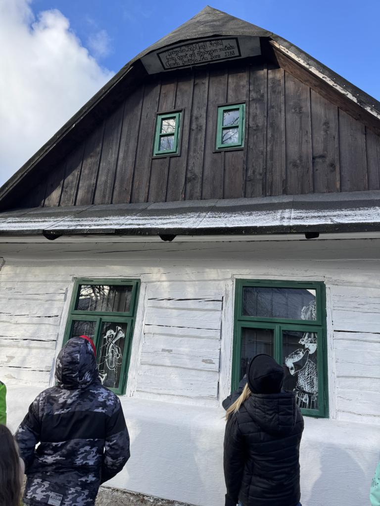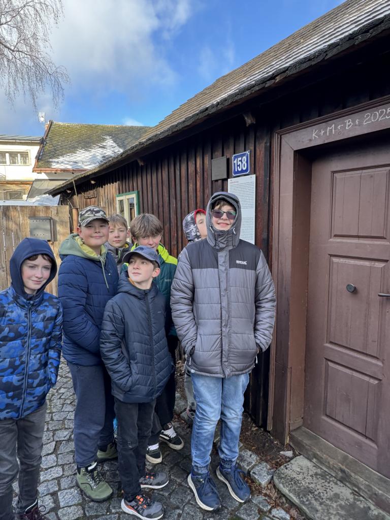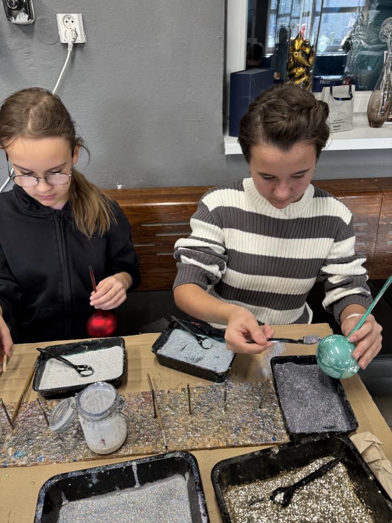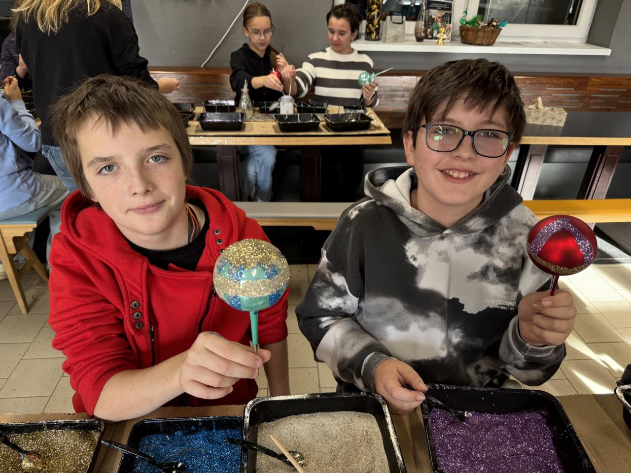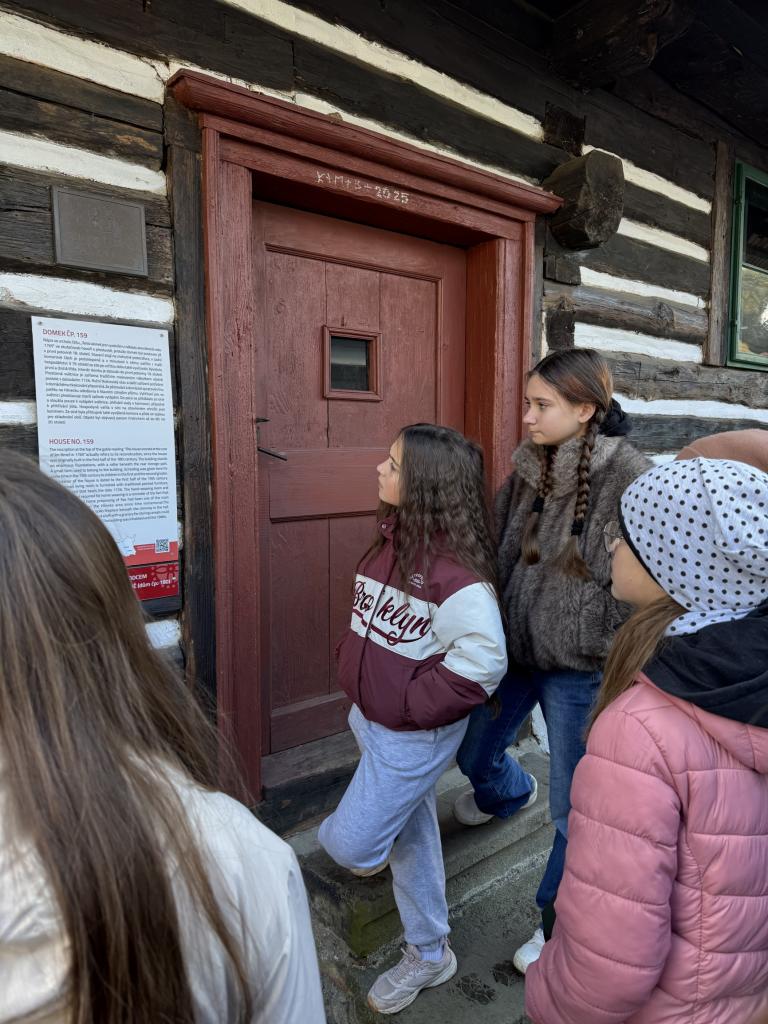 Roubenky v Hlinsku jsme si prohlédly sami, ale dostávali jsme záludné otázky v češtině i angličtině. Zjistili jsme jak bydlí ševc, pilníkář, hračkář atd. V jednom z domků je expozice masopustních masek z Hlinecka ( zapsáno v UNESCO ). Pak jsme se přesunuli do firmy Koulier v Oflendě. Prohlédli jsme si výstavu vánočních stromků, hledali jsme nejhezčí stromek nebo dvojice, které k sobě patří. Navštívili jsme místní obchůdek s ozdobami. Nakonec nás čekala prohlídka firmy od foukání skla až po zdobení a balení ozdob (nesmělo se tam fotit) .Pak jsme si sami vyzkoušeli zdobení ozdob ,zjistili jsme , že to není nic jednoduchého. Bylo to super.