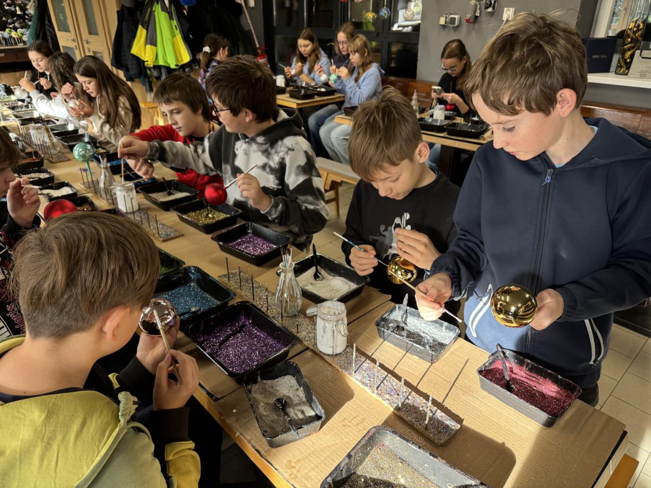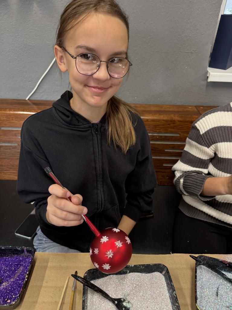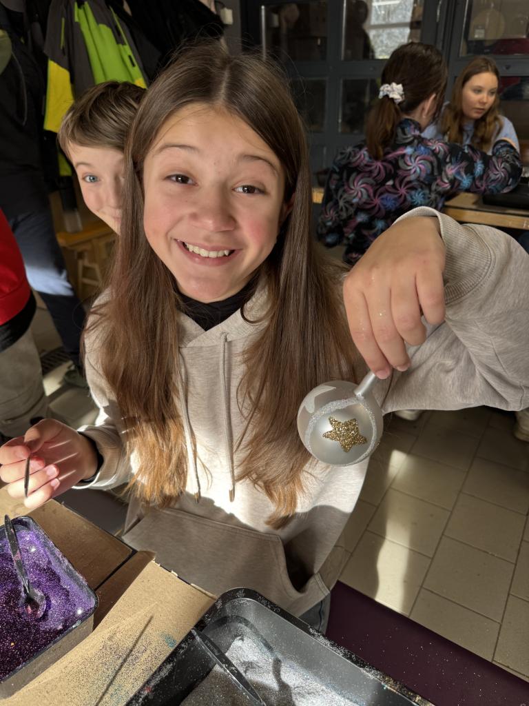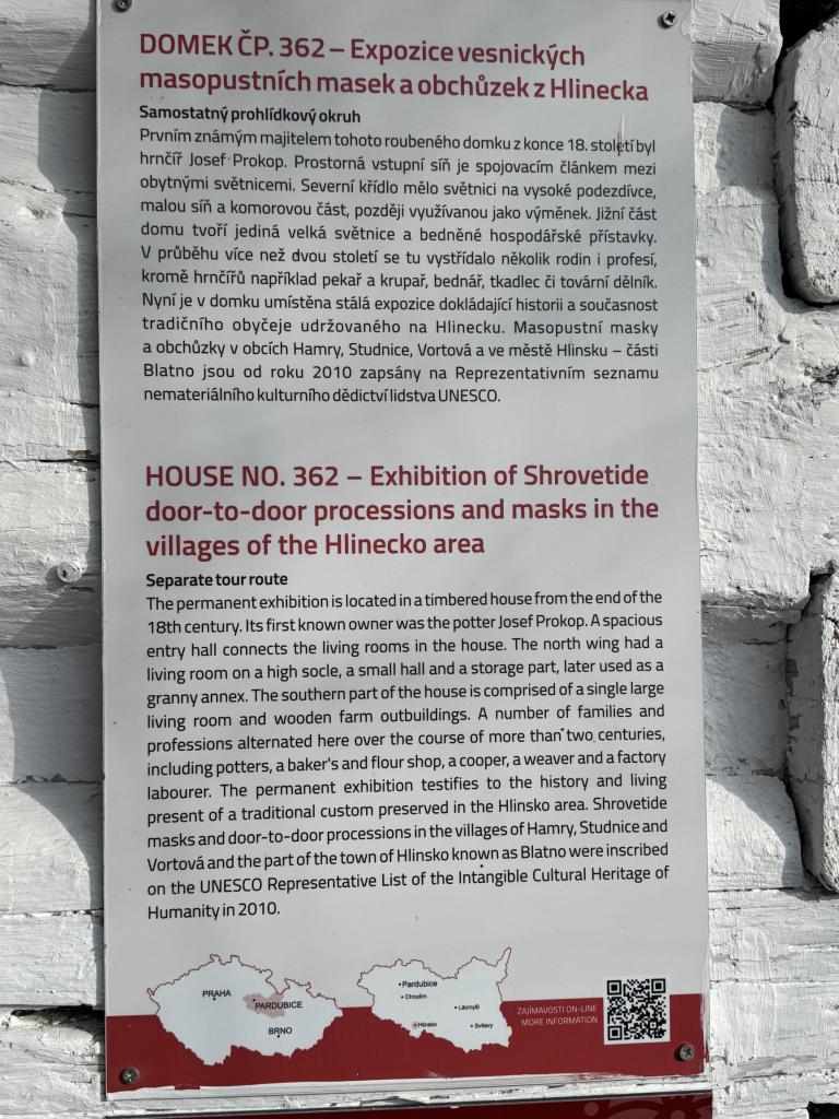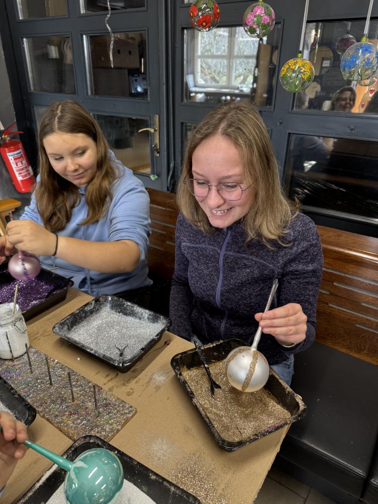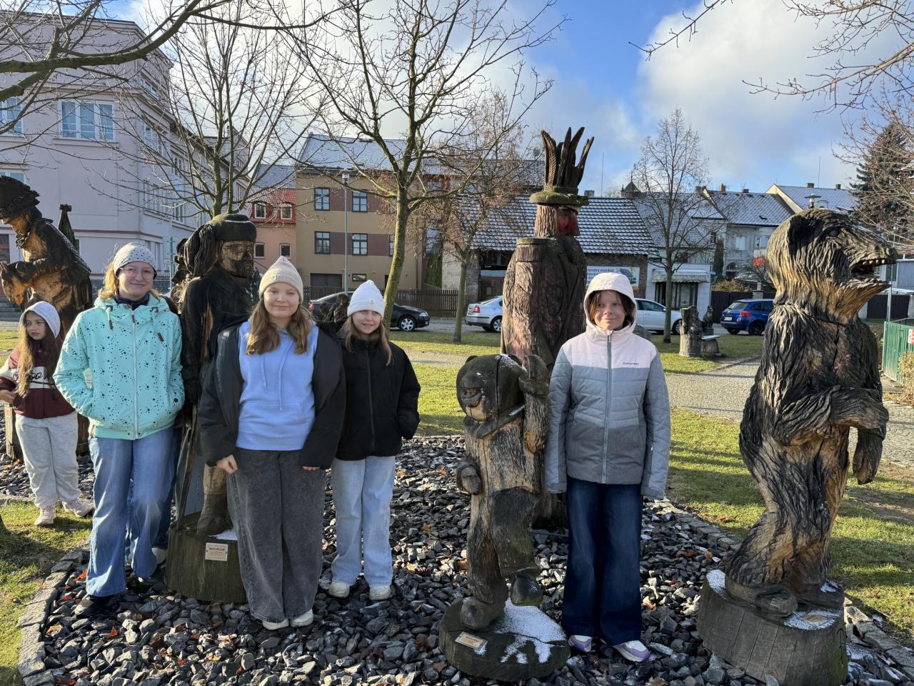 Roubenky v Hlinsku jsme si prohlédly sami, ale dostávali jsme záludné otázky v češtině i angličtině. Zjistili jsme jak bydlí ševc, pilníkář, hračkář atd. V jednom z domků je expozice masopustních masek z Hlinecka ( zapsáno v UNESCO ). Pak jsme se přesunuli do firmy Koulier v Oflendě. Prohlédli jsme si výstavu vánočních stromků, hledali jsme nejhezčí stromek nebo dvojice, které k sobě patří. Navštívili jsme místní obchůdek s ozdobami. Nakonec nás čekala prohlídka firmy od foukání skla až po zdobení a balení ozdob (nesmělo se tam fotit) .Pak jsme si sami vyzkoušeli zdobení ozdob ,zjistili jsme , že to není nic jednoduchého. Bylo to super.