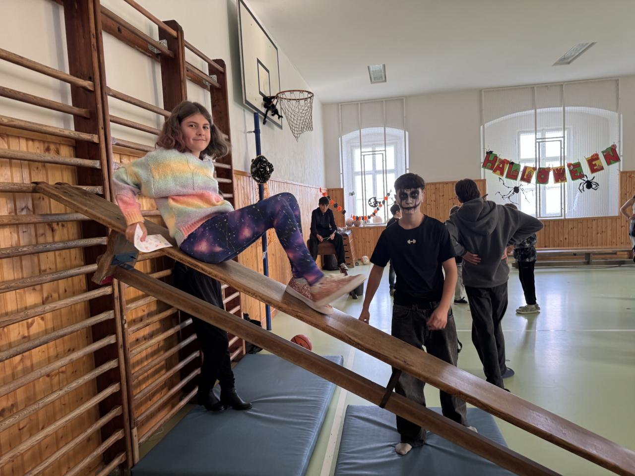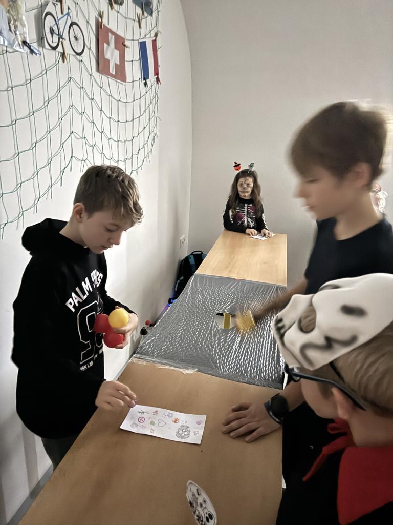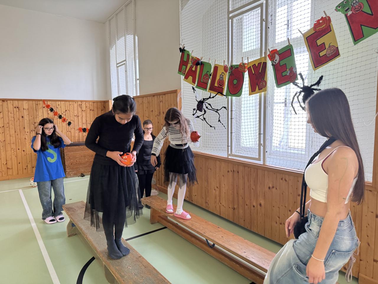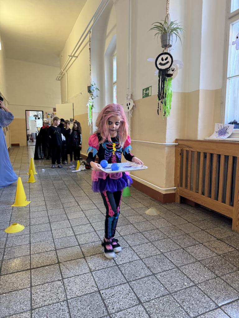 Třída 9A si připravila "Halloweenský tělocvik" v tělocvičně a na přilehlé chodbě. Bylo plné obratnosti. Také proběhla fotbalová, florbalová a basketbalová abeceda i funny stolní tenis. Všechna prvostupňová strašidla prošla na jedničku. Další velké stanoviště si připravila 6A v suterénu školy. Bylo zde krátké disco, tanec kolem židlí a cvičení podle Youtube, dýňové piškvorky, házení plyšáků do obrovských pohyblivých kalhot , ochutnávky, postřehová cvičení, puzzle překladové či matematické, vyrábění záhadných letkvarů, záhadná krabice, různá vyrábění, trochu jiné člověče nezlob se. Obě tyto třídy se setkaly s celým prvním stupněm..