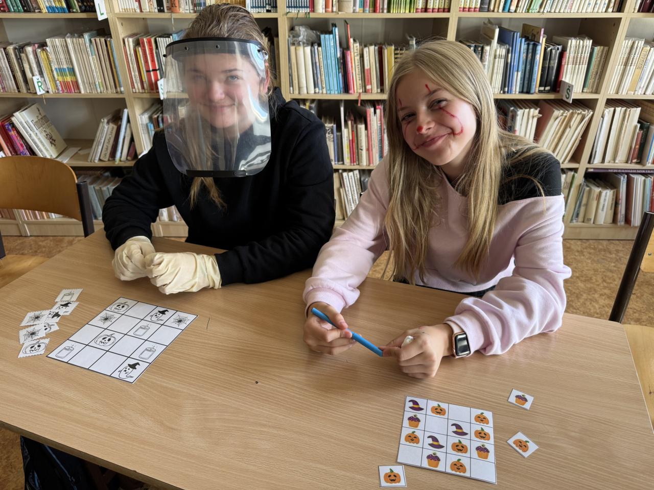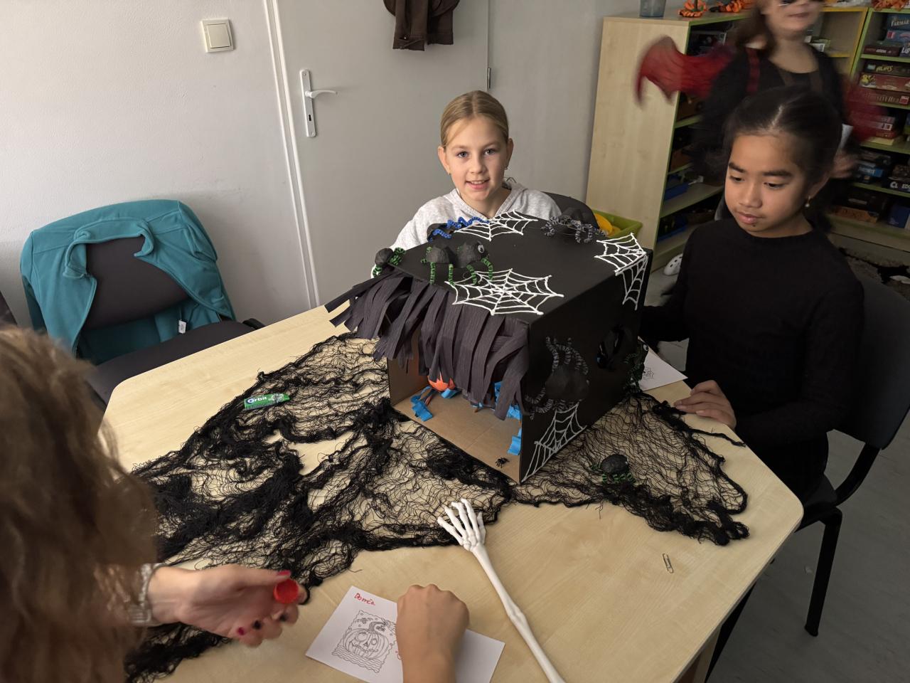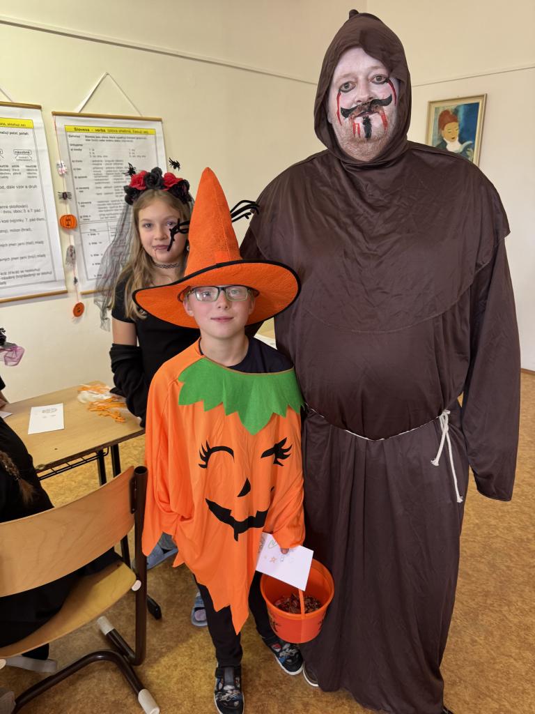 Třída 9B měla zajímavé chemické pokusy a zvláštní záhadné tekutiny či oblékání /svlékání kostlivce na čas, ale také závod švábů. Jinak musím pochválit ostatní třídy (6B, 7. a 8. ročník), které měly mnoho zajímavých či těžkých úkolů, skládaček, opakování angličtiky, házení na cíl, postřehových cvičení nebo zdobení perníčků. Nikdo se nebál sáhnout do záhadných lahví nebo složit kostru či lebku, zahráli si obrázkovou halloweenskou sudoku , ale našli jsme i stanoviště s pitným režimem pro strašidla.. Moc se to všem povedlo. Malá strašidla byla velmi spokojena. Nakonec každý dostal " Halloweenské vysvědčení". Děkujeme Unii rodičů a hlavně rodičům, kteří připravily zdravé občestvení. Velké poděkování žákům druhého stupně za přípravu halloweenského dopoledne.
